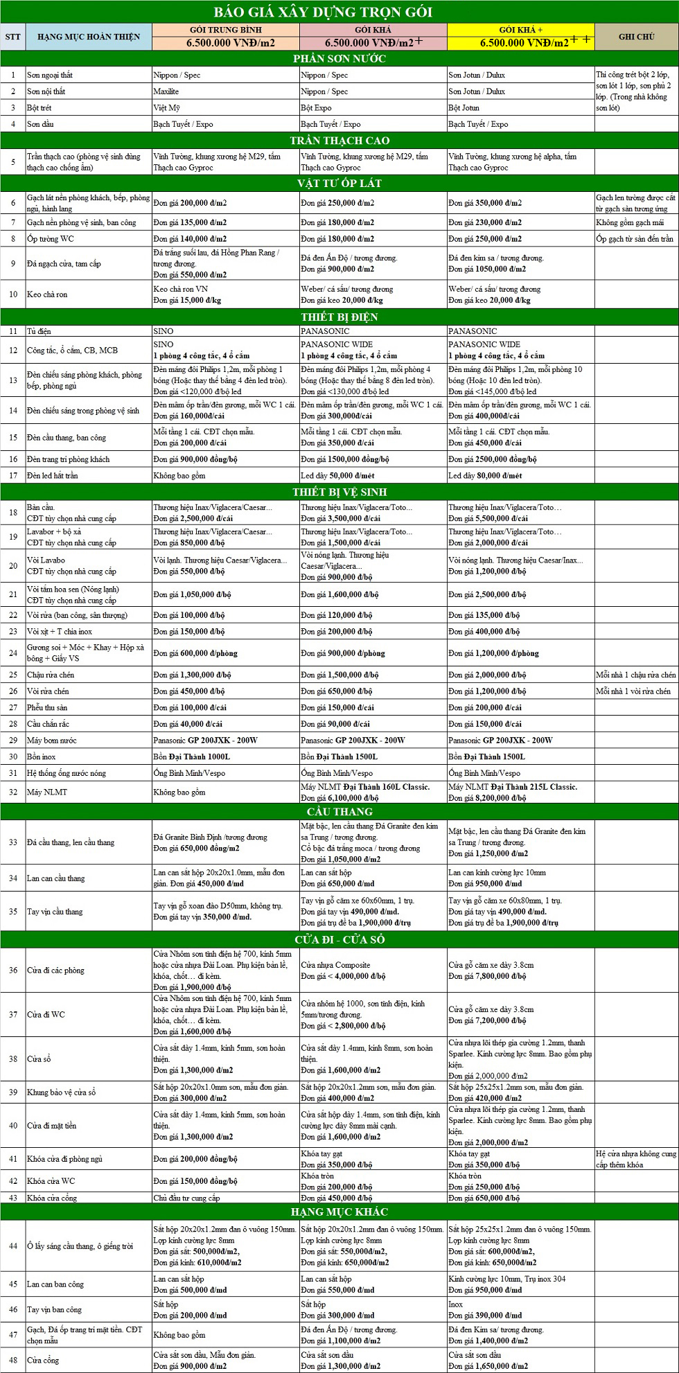 - Gói trọn gói: 6.800.000 – 10.000.000 đ/m².